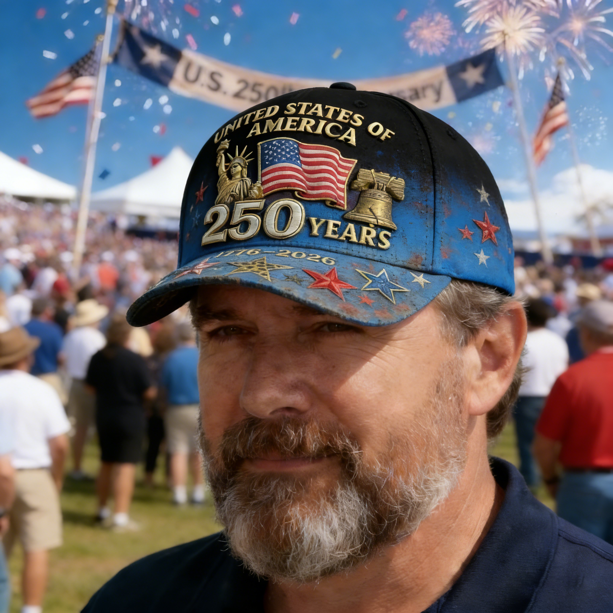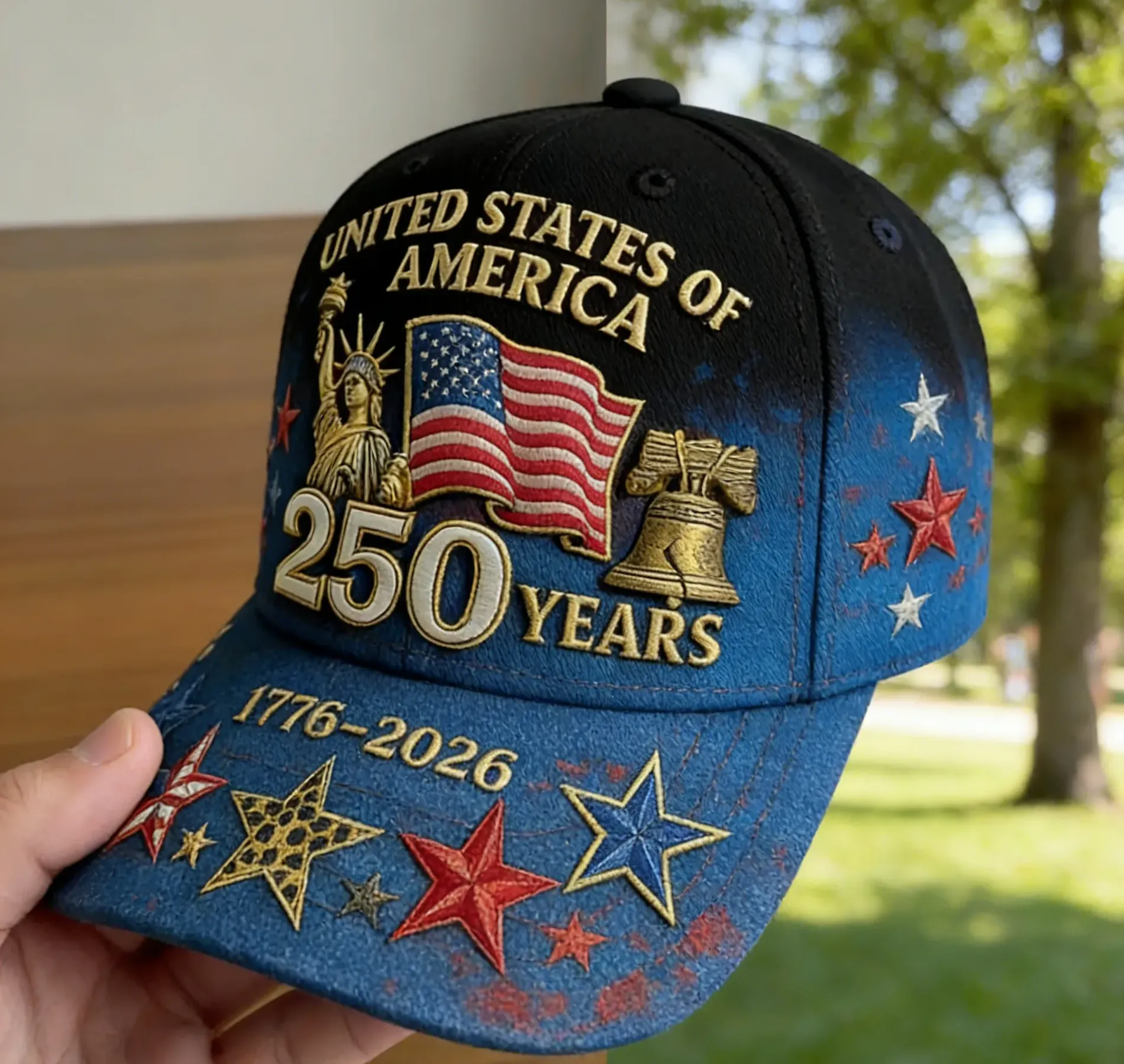 • Embroidered Details: U.S. flag and 250th Anniversary & Independence, Freedom, Republic text